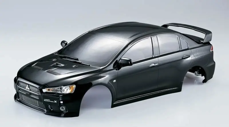 Pomalowana i złożona karoseria Mitsubishi Lancer Evo X w kolorze czarnym z akcesoriami. Zestaw jest bogaty w szczegóły – zestaw chromowanych części (przedni i tylny emblemat, szkła lusterek, rury wydechowe oraz reflektory), zestaw czarnych plastikowych elementów (lusterka, wycieraczki, spoiler, tylny dyfuzor).