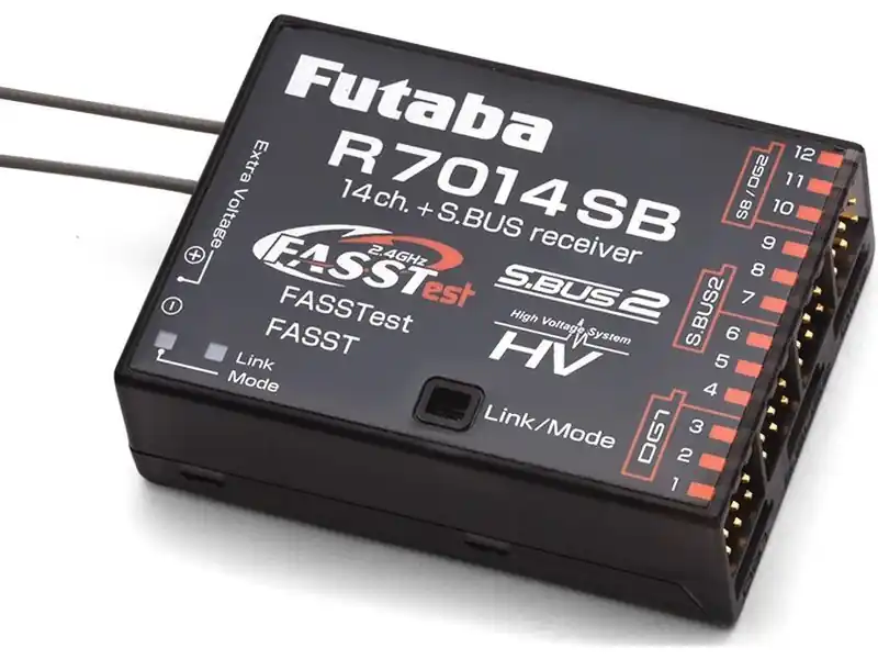 Odbiornik RC Futaba R7014SB z modulacjami FASSTest i FASST jest przeznaczony do większych modeli RC samolotów czy śmigłowców. Odbiornik ma fizycznie 14 wyjść PWM (kanał 1 do 12, DG1 i DG2) oraz wyjścia S.BUS i S.BUS2, na których do dyspozycji są wszystkie 18 kanałów. Odbiornik ma miniaturowe rozmiary i masę tylko 21g, także nie będzie problem umieścić go w wąskich kadłubach czy ograniczonych przestrzeniach.