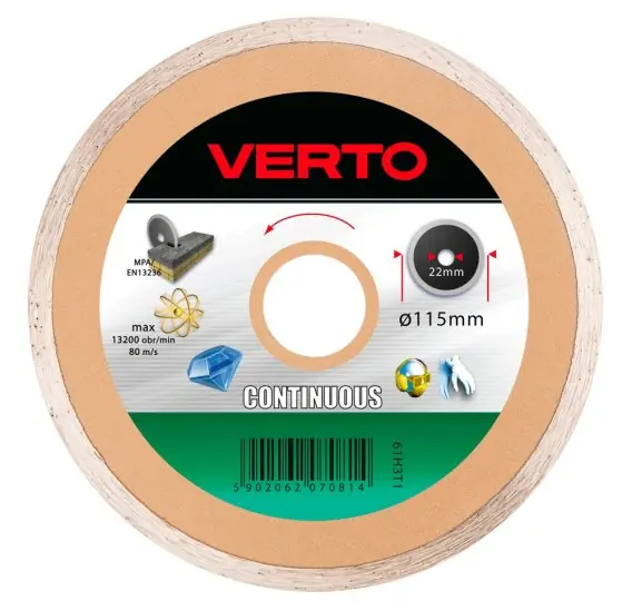 Tarcza diamentowa VERTO 180 x 22.2 mm charakteryzuje się wyjątkową trwałością oraz skutecznością cięcia. Jej konstrukcja została zaprojektowana tak, aby zminimalizować ryzyko pęknięć oraz uszkodzeń podczas intensywnego użytkowania. Dzięki zastosowaniu diamentowego ostrza, tarcza zapewnia czyste i precyzyjne cięcia, co jest kluczowe w przypadku obróbki materiałów o dużej twardości.