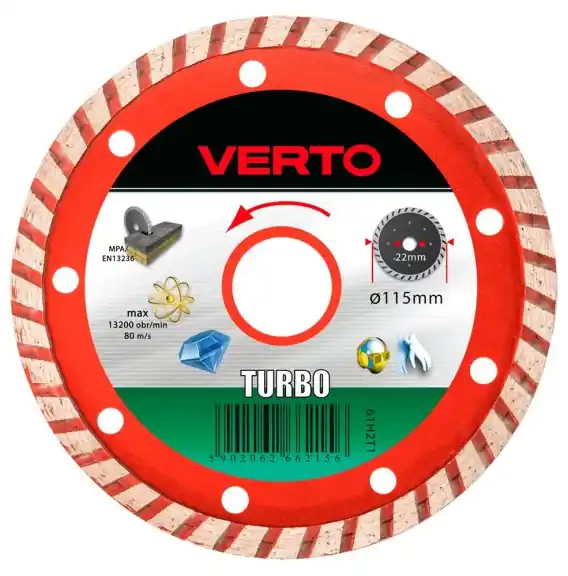 Tarcza diamentowa turbo VERTO (nr ref. 61H2T1) o średnicy zewnętrznej 115 mm to doskonałe narzędzie do cięcia różnorodnych materiałów budowlanych. Dzięki swojej konstrukcji, tarcza zapewnia wysoką wydajność oraz precyzyjne cięcie elementów wykonanych z betonu, betonu zbrojonego, granitu, marmuru, kamienia, cegły i wielu innych. Marka VERTO, znana z wysokiej jakości elektronarzędzi i akcesoriów, gwarantuje niezawodność i trwałość swojego asortymentu, co czyni ją idealnym wyborem dla każdego majsterkowicza oraz profesjonalisty.