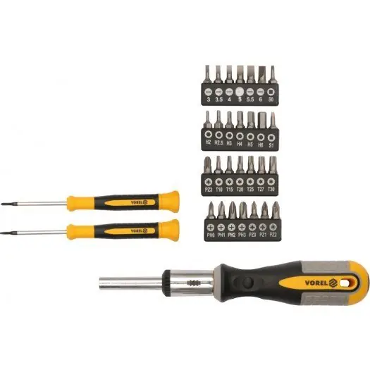 Bardzo dobrej jakości zestaw zawierający wkrętaki, oraz bity marki Vorel 54655.
