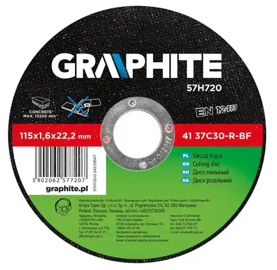 Tarcza do cięcia kamienia GRAPHITE (nr ref. 57H722) o średnicy zewnętrznej 125 mm, dzięki zaawansowanej konstrukcji i redukcji grubości pozwala znacząco skrócić czas cięcia. Zapewnia wysoki poziom bezpieczeństwa pracy dzięki zgodności produktu z normą EN12413.