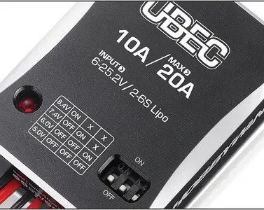 Regulator UBEC 25A podłączony do pakietu zasilającego LiPo 3-18S zmniejsza i stabilizuje napięcie na poziomie 5.2V, 6V, 7.4 lub 8,4V (do wyboru mikroprzełącznikiem DIP), które można wykorzystać do zasilania odbiornika, serw, żyroskopu itp wtedy gdy nie dysponujemy BEC-em a nie chcemy dodatkowego pakietu 4.8V luv 6V oraz wtedy gdy BEC zintegrowany (wbudowany) z regulatorem obrotów jest za słaby by obsłużyć prądowo wiekszą ilość serw i innych podzespołów.