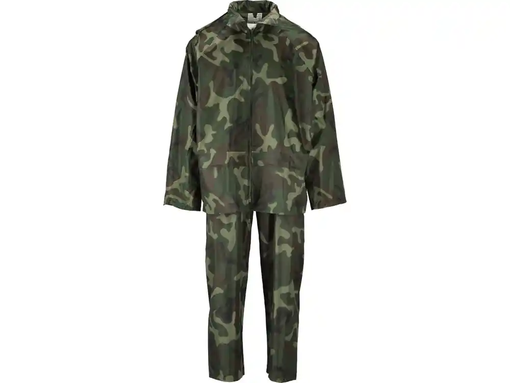 Komplet przeciwdeszczowy moro 2-częściowy74647 marki Vorel. Kurtka z dwiema dużymi kieszeniami i regulowanym kapturem, spodnie z rozciągliwą gumką w pasie oraz ze szczelinami po bokach przez które możemy sięgnąć do kieszeni spodni. Mieszanka PVC z poliestrem to materiał wodoodporny i nie przepuszczający powietrza. Nadmiar ciepła wydostaje się spod materiału za pomocą szczelin wentylacyjnych na plecach oraz otworów pod pachami.