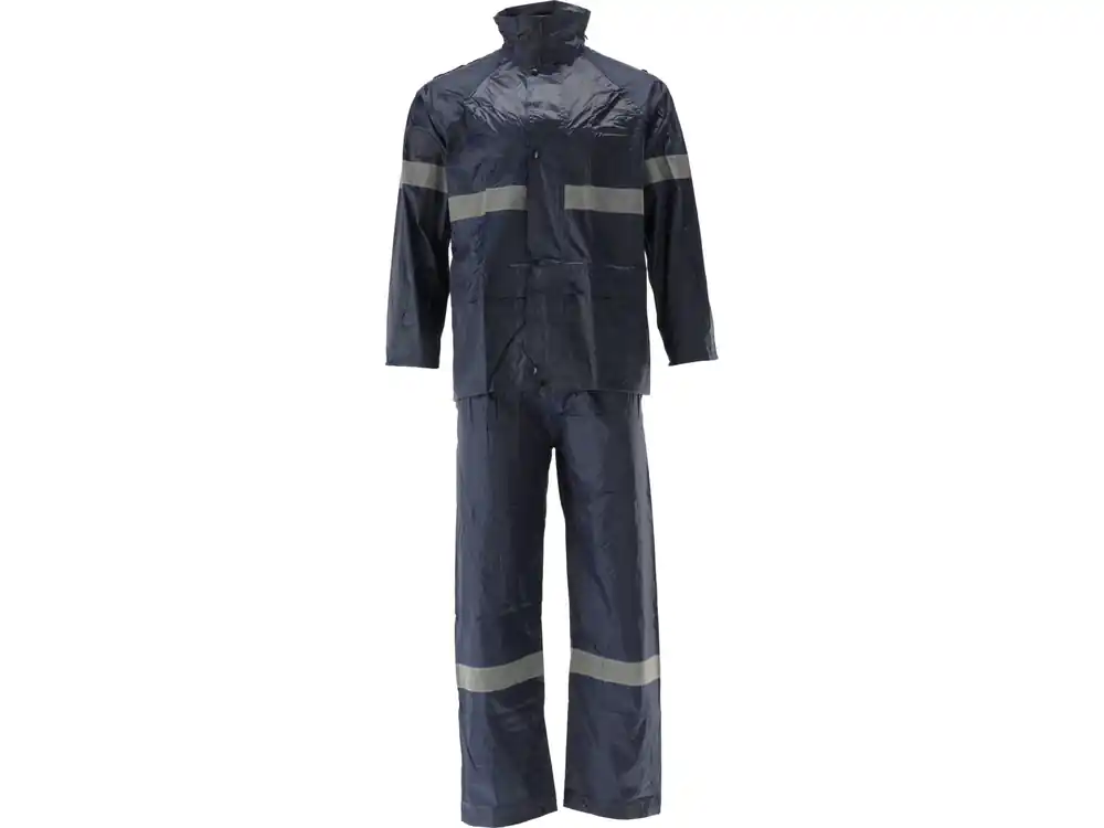 Komplet przeciwdeszczowy 2-częściowy z poprawiającymi widoczność pasami odblaskowymi. Kurtka z dwiema dużymi kieszeniami i regulowanym kapturem, spodnie z rozciągliwą gumką w pasie oraz ze szczelinami po bokach przez które możemy sięgnąć do kieszeni spodni.
